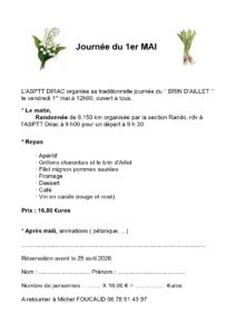 1er MAI Le mardi 28 Avr 2026 à 18h05 PM Les categories associées : AssociationsJ’aime DiracNos agendasDroits et DémarchesNous contacterAssociationsUrgences et GardesMenusSallesTravauxGaleries photosPartager :