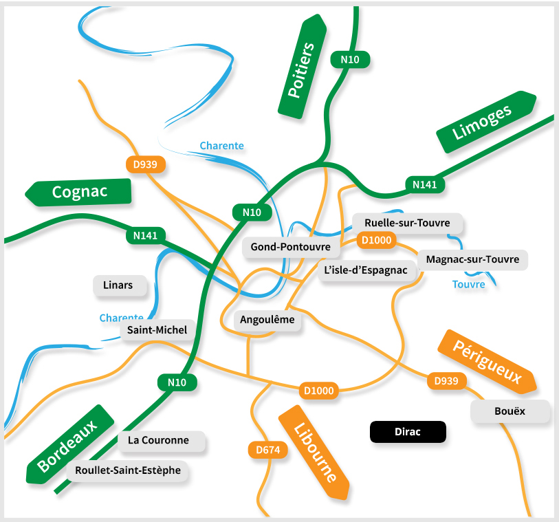 Pour rejoindre Dirac en train il faut s'arrêter en gare d'Angoulême.