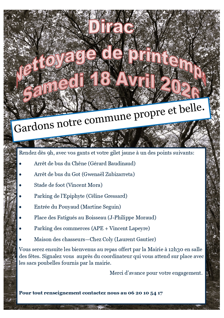 Mis en avantNettoyage de printemps 2026 Rdv des 9H00 avec vos Gants et votre gilet jaune à un des points suivants : Arrêt de bus du Chêne - Gérard BAUDINAUD . Arrêt de bus du Got - Gwenaël Zubizarreta. Stade de foot - Vincent Mora. Parking de l'Epiphyte - Celine Gressard. Entrée du Pouyaud - Martine Seguin. […]
